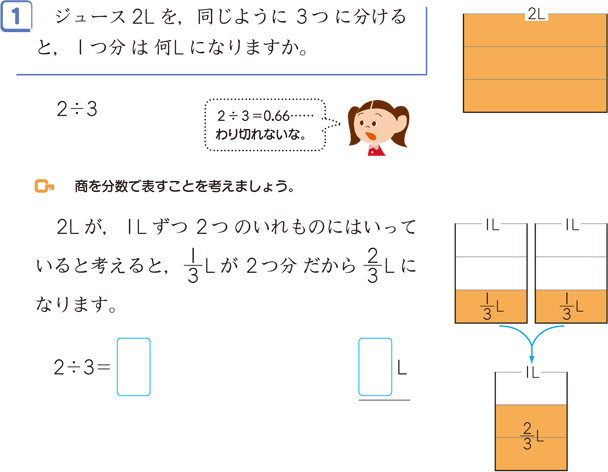 教科書では,次のような手順で,かさを材料にして2÷3=2/3を導くようにしています。