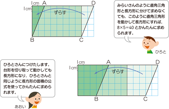 等積変形とは,面積の大きさを変えないで形を変えることをいいます。主に既習の求積可能な図形に変形し,求積の仕方を考えるときに用いられます。