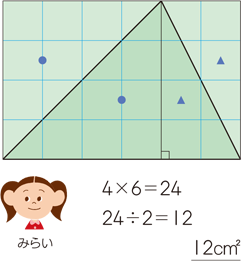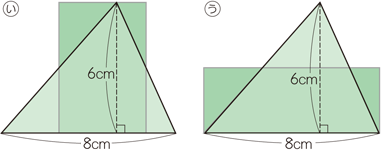 三角形においても長方形に等積変形することができます。下の図(い)は三角形の底辺の2分の1が長方形の横の長さに,下の図(う)は高さの2分の1が長方形の縦の長さになっています。