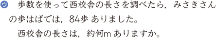 計器を用いる実測とは違って,直接的に計器を使わずにある量のおよその大きさを測ることを,概測といいます。長さ,面積,体積などの概測が考えられますが,下の例は,歩幅を利用した長さの概測です。