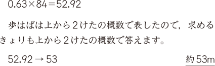 ところで,概測において注意したいことは,概数の計算をどのように行うかです。上の例でいえば,歩幅は上から2桁の概数ですから,その積の値を詳しく求めてもあまり価値がありません。そこで,積も下のように,上から2桁の概数にします。