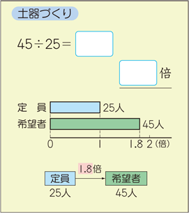 上の例のように,もとにする量の何倍になっているかは,わり算で求められます。