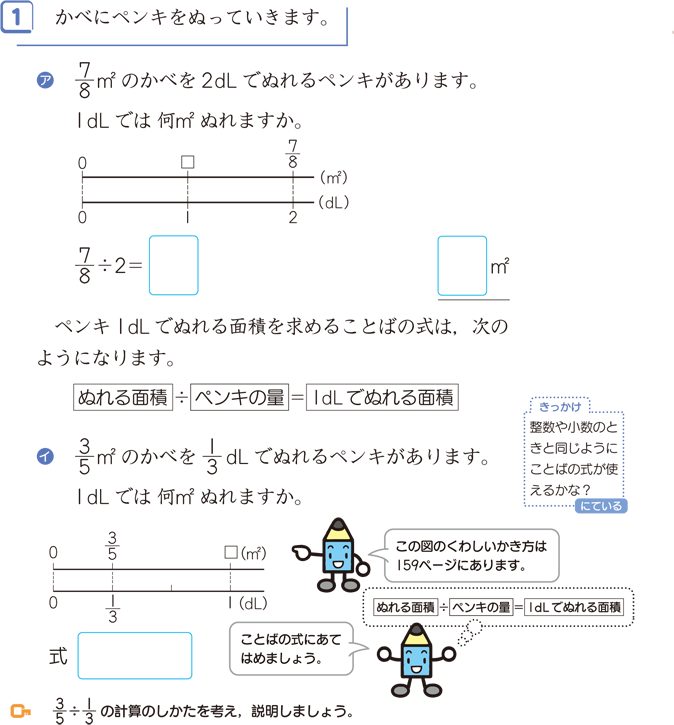 分数の除法では,計算の仕方を考えるのに,図を使う方法とわる数を1にする(逆数をかける)方法があります。どちらも単位量あたり(1あたり)を求めることになることをよく理解させることが大切です。