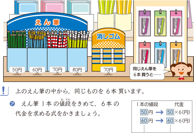 上の例では,代金は,○×6と表せますが,この○は,50,60,70,80の値をとることができ,変数としてのはたらきをしているわけです。