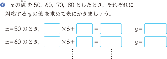 xとyを使った式において,xの値をいろいろに変えてyの値を求め,xやyの変数としての意味の理解を深めていきます。例えば,下のようにx×6+70=yの式にxの値をあてはめていきます。