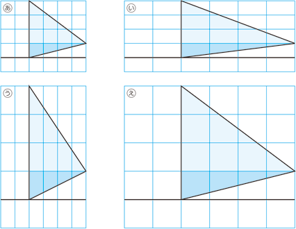 拡大図や縮図の意味を理解させるには,もとの図を,横の方向に2倍にした図,縦の方向に2倍にした図,縦と横の両方向に2倍にした図を示し,形が同じといえるのはどれかという課題で学習を進めるのが効果的です。