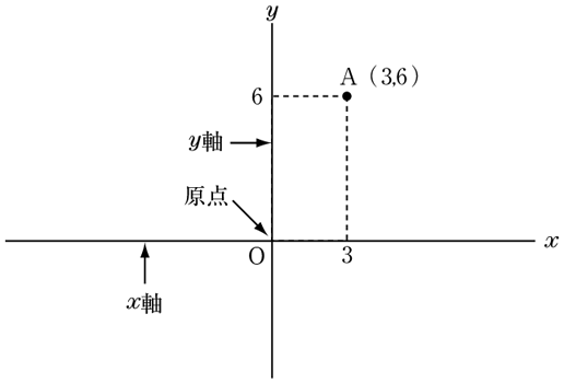 伴って変わる2つの数量があって,その間に関数関係があるとき,この2つの数量はともに変量です。この2つの変量の間には1対1の対応があります。独立変数xの値を横に,従属変数yの値を縦にとったのが関数のグラフです。縦の線をy軸,横の線をx軸といい,垂直に交わっています。x軸とy軸の交わった点を原点といいます。