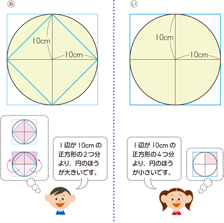 まず,半径10cmの円の面積が半径(10cm)を1辺とする正方形の面積のおよそ何倍になるかを考え,下のように円の面積の見当をつけます。