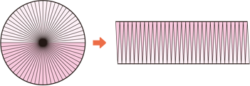 最後に,円を等分して並べかえ,長方形に限りなく近い形に表し,円の求積公式を導きます。