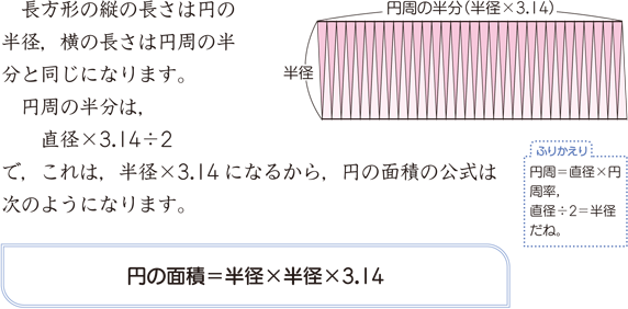 円の面積は,半径×半径×3.14で求められます。この求積公式の指導にあたっては,公式の理解はもとより,そこに至る過程を大切に指導することが重要です。