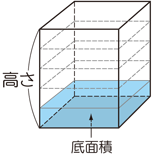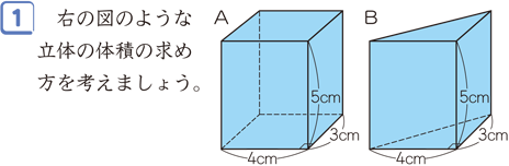 上のAの四角柱の体積は,直方体の体積=縦×横×高さの公式から,縦×横が底面積であることをおさえ,底面積×高さで求められることを理解させます。