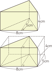 この後,一般の角柱についても三角柱に分けて考えることができることから,どんな角柱でも,底面積×高さで求められることへと導いていくとよいでしょう。