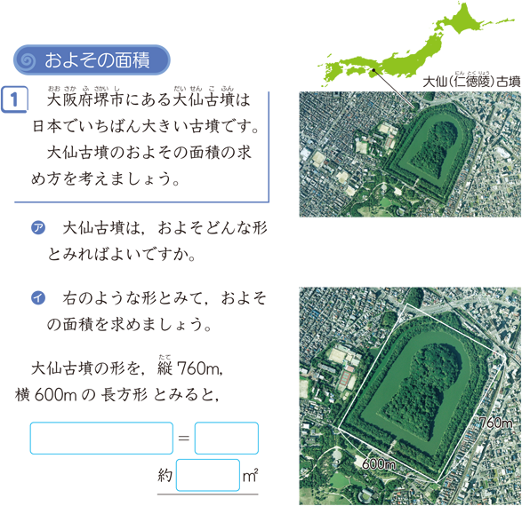 身の回りにある形について,その概形をとらえ,およその面積などを求めることができるようにする。……第6学年