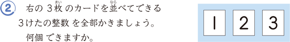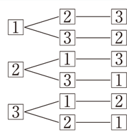上の例は,3つの違った数1,2,3の順列をつくる問題ですが,これを右のような図に,順序よくかいていくと,すべての場合を落ちなく重なりなくあげることができ,順列の数6も求められます。このような図を樹形図といいます。