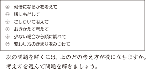 本教科書では,思考法を養う文章題として,第2学年から様々な考え方を取り上げてきました。