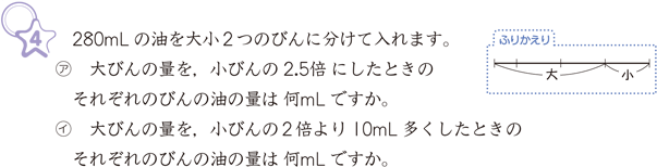 大瓶を小瓶に置き換えれば解決できることに着目できなければなりません。アでは大瓶を小瓶に置き換えれば小瓶の3.5本になり,280÷3.5=80で小瓶は80mLとなります。イでは置き換えと順に戻して考えることから(280-10)÷(2+1)=90となり,小瓶は90mLと問題を解くことができます。