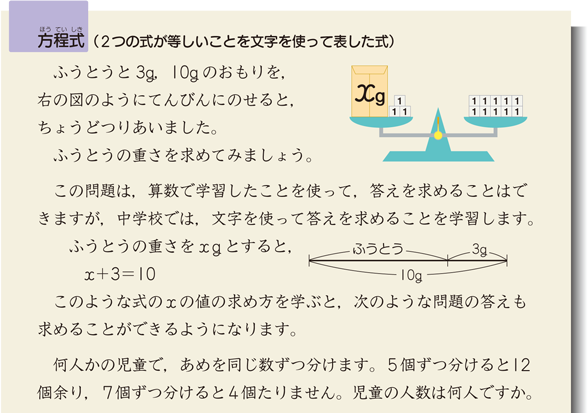 方程式の見方,立式,解の求め方についての組織的な学習は中学校で行います。