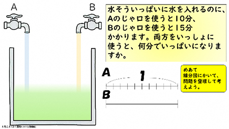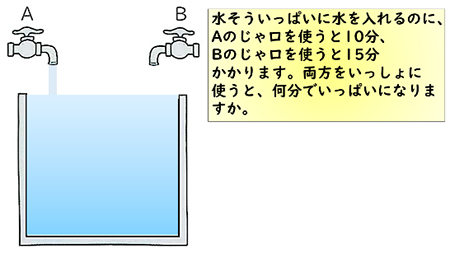水そういっぱいに水を入れるのに,Aのじゃ口を使うと10分,Bのじゃ口を使うと15分かかります。