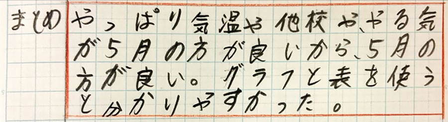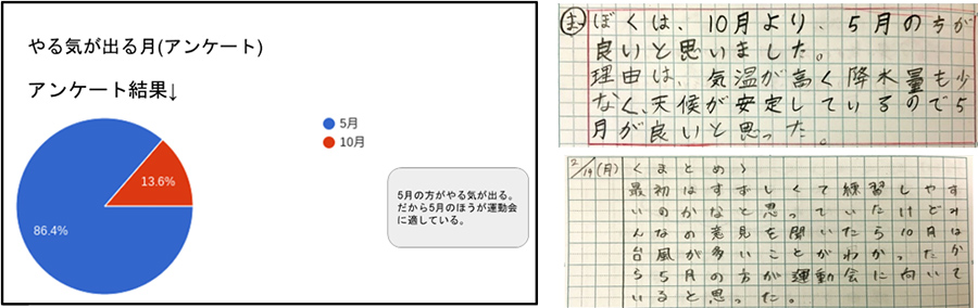 結論付けの場面から,児童自らが必要な資料を使って運動会の開催時期について結果を出していたり,結果をもとに,新たに自分の考え以外の観点について再び考察しようとしたりする児童の意見があった。「C26 11月下旬は,日照時間は長いけど平均気温が9度で低いからやめた方がいい。」や「C30 ぼくは,みんなの考えを聞いて,7月上旬に変えようと思いました。」の意見から考察を捉え直すことにつながったと考えられる。