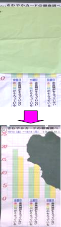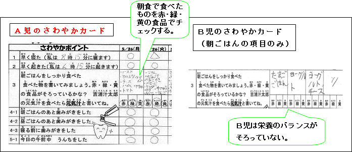 本校では,子どもたちが生活のリズムを整え,朝ご飯をしっかり食べて「今日も頑張るぞ!」という気持ちが持てるように下のような「さわやかカード」を実施している。この「さわやかカード」から,約半数の子どもたちは朝食をとっているが,栄養のバランス(赤・緑・黄の栄養)がとれていない実態があることが分かった。そこで,児童の生活を映し出した資料であるさわやかカードを教材化することによって,算数科の指導内容の一つである資料の活用に関する指導をより充実させ,さらに自分たちの生活を見つめ直させたいと考えた。