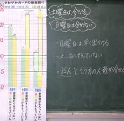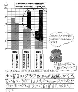 ○ 全校で取り組んでいる「さわやかカード」の情報を教材化したことによって,子どもたちの生活から出てきた身近な資料であるために学習意欲が高まり,自らグラフの傾向や特徴をよみとろうとしていた。