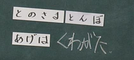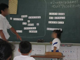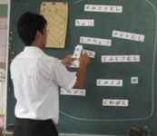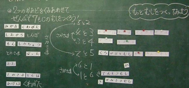 誰もが1つは虫をつくってノートに書くことができたら,「どんな虫ができたのか発表しましょう。」と投げかけた。教師が,虫を書いた数の少ない子どもから当てていく。2枚のカードをもたせて,「"しおから"と"とんぼ"で"しおからとんぼ"です。」と発表させた。本当に7文字で,できているのかを1文字ずつ数えて確認した。7文字になっていれば黒板に貼っていった。