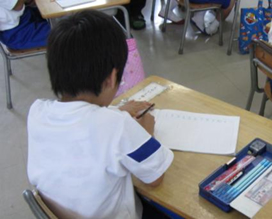 小学校に入って間もない子どもたちであるので,算数をとても楽しみにしている。各教室で行われる授業は,おはじきを両手に入れて,あといくつで6になるかを考えたり,いす取りゲームをして,赤と青のぼうしの人数を数えたりしながら,楽しい活動が繰り広げられる。生活にある様々なものを組み合わせながら,「2と3で5だね。」と,子どもたちが自然と口にすることができるように数を合成・分解する感覚を身につけさせていきたいと考える。