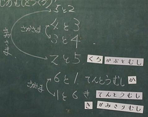 「どんな虫ができるかな?」では,2つの言葉を組み合わせて虫をつくりながら,数の合成・分解を学ばせていこうとするものである。ことばを組み合わせながら複合語を作ることは,数の合成・分解に子どもたちが気付いていく学習となる。
