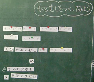 見つけ方を確認したところで,「じゃあ,今度はみんながカードをつくって,いろいろな虫をつくってみよう!」と投げかける。子どもたちは,「きあげは」「てんとう」「だんごむし」「あかあお」など,知っている虫を言葉の数で切ってあるカードに書いていく。