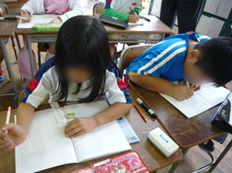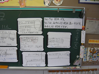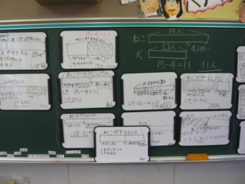 本学級の児童は,喜んで学習に取り組む子が多い。しかし,個人差が大きく,基礎的・基本的な知識と技能の習得に時間のかかる児童も少なくない。1学期の「かくれたかずはいくつ」の学習では,場面をイメージしたり,動作化をしたりしてから自分の考えを発表ボードに書き,2人,グループ,全体で考えを伝え合う活動をしてきた。答えを導き出す手立ての一つとして,テープ図を導入した。児童はテープ図に表すことの難しさを感じながらも,便利さや分かりやすさに気付き,好んでテープ図に表す児童も増えてきた。