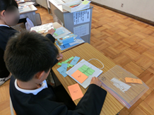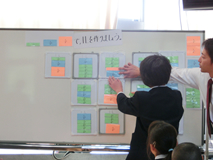 学習過程を「課題提示」→「自力解決」→「学び合い」→「適用問題」と設定し,学習を進めてきた。「学び合い」の学習では,グループ学習(3人)で話し合った結果を当番が全体に説明することにしている。説明の苦手な児童はグループの仲間に助けられながら説明してきた。繰り返し活動するうちに少しずつではあるが自信もついてきた。自分の考えをどのように説明させるのか明確にし,意見を出し合う場を多く設定することで数学的な思考力や表現力,活用力を高めていきたい。