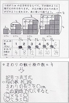 また,段の数を大きくした適用題に取り組ませることにより,変化の規則性を活用して,より能率的に問題を解こうとする姿が見られた。発展的に条件を変えた場合を考えさせる手だてによって,自分たちが気付いた規則性の中でも,より一般性や能率性の高い考えを選択していこうとすることができてきたと考える。