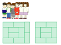 T 気づいたことはないですか? C 左の部屋が10枚。右の部屋が5枚。 C 左の部屋が多い。大きい。広い。 C 左の部屋が広く使える。 C でも,何人かわからないから,わからない。 C 先生,何人で使うんですか? T そうかすごいことに気づいたね。人数がいるのか。 C そうです。人数がいります。 T じゃあ,これでは・・・ C これなら1人で5枚と10枚だから,左。 T いいのかな? C えっ,ふえるのか。 C これなら同じ。2人で10枚なら1人5枚。 T なるほどね。納得ですか? C はい。 T すごいね。1人5枚と平等にして考えたんだ。 |