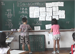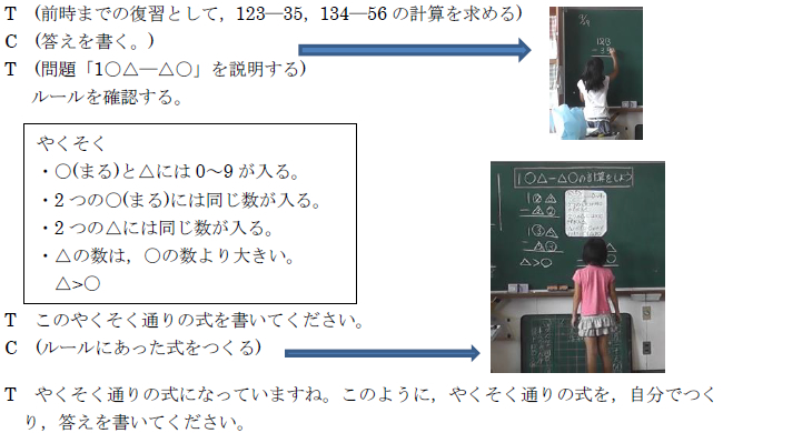 本時の授業では,たし算を含め,筆算の学習で培ってきた「正確性」を大切にしながら,教材の工夫により,筆算においても,児童に対し,数の並びから数の関係に気付く「発見性」,「探究性」を求めた。また,授業構成では,筆算の授業で表出の多い,記号的表現(式化),言語的表現(言葉による説明)だけでなく操作的表現(位取り表の活用)にも留意した。