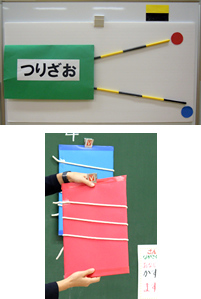 釣竿は,はしを隠して提示することで,「はしをそろえるとよい」「ならべるとよい」などの意見を出させ,既習の学びを想起させた後,動かさずに長さ比べをする課題を与えた。