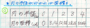 単元の導入として,一方が決まるとそれに伴ってもう一方も決まる2量の関係を考えた。子どもたちに,どんな関係があるかを聞くと,「速さと時間」「円の半径と面積」「勝負」「ジュースの本数と値段」など,これまでの生活体験や学習などに基づいた関係が出された。授業では,子どもたちの出した関係から,次の4つを選び表にして比べることにした。