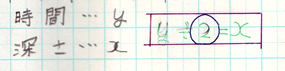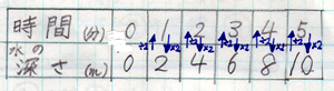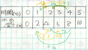 第2時では,前時で学習した比例の関係を詳しく調べた。お風呂の水の深さと入れる時間の関係を表で表し,どんな変わり方をしているのかを詳しく調べる課題を提示した。この時間では,比例関係にある表を縦に見たり,横に見たりして新たな見方を見つけたり,これまでの気付きを確認したりした。また,既習の文字式で比例の関係を表すことで,きまった数を見つけ,文字式で表すことの良さに気付くことができた。