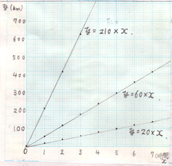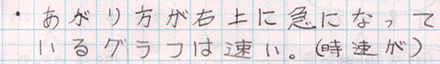 第6時では,比例のグラフをかき,比例のグラフの特徴を調べた。ここで大切にしたことは,同時に3つの関係を同じグラフ上に表したことである。3本の直線を比べ,同じ所と異なる所を考えることで,比例のグラフの特徴をより理解することができる。また,1mmの方眼のグラフ用紙を用いることで,細かい数値にも目を向け,連続量としての比例を意識できるようにした。