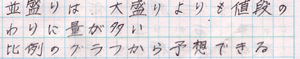 今回の実践では,大盛よりの並盛の方が,値段に対し量が多いということが分かった。子どもたちにとっては,なぜ並盛の方が量が多いのかという疑問が生まれた瞬間であった。量を重さだけで考えていいのか。並盛を敢えてお得にしているのではないのか。子どもたちは算数から生活に場面を戻し,考えていた。生活場面からスタートし,算数を使って求め,もう一度生活場面で考える。比例ではない場面を扱うことで,比例の考えをより深めて,理解することができた。