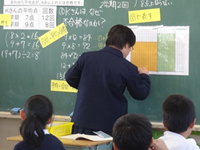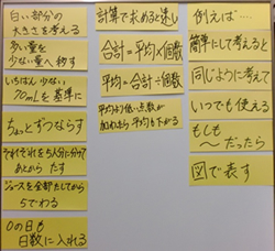 授業の中のひらめきやつぶやきも含め,子どもが考えたことを子どもの言葉で目に見える形(アイデアカード)にして蓄積し掲示することで,ただ答えを出すことだけでなく,カードの中に使えそうな考えはないか,ほかにいい考えはないかなど,答えにたどり着くまでの考えを意識させたい。既に存在する「数学的な考え方」という枠を子どもに与えるのではなく,子どもから数学的な考え方を生み出していきたい。
