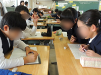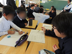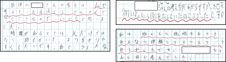 ノートの感想には,友達の説明のわかりやすさに感心したことや図を使って考えてみたいということ,友達の考えとの違いや友達に説明して理解してもらえた喜びなどが書かれてあった。話合い活動を積極的に取り入れることで,自分の考えや説明を洗練したり,友達の説明を聞いて新たな考えを知ったり,生み出したりできると考える。