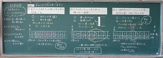 2時間目では,身の回りから伴って変わる2つの量を見つけて式で表したり,表をかいたりした。