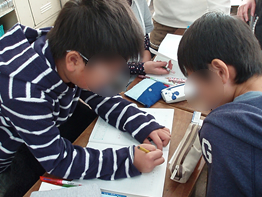 1時間目に学習した内容や,教科書に出ている他の例も参考にしながらそれぞれ取り組んだ。題材を何にしようか迷ったり,式や表に表せなかったりする児童に対して,周りの児童がアドバイスをしている様子が見られた。
