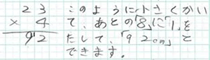 しかし,この自力解決の中で,ノート例のように「繰り上がりの1を小さく書く」などの筆算の手順のみを書く児童も多くいた。これらの児童が「部分積の和」について思考できているかを確かめる上で,次のように発問をした。児童が23×4の答えは92であると発表した後のことである。