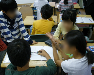 児童はこのような手順で計算をしている。一の位の計算や繰り上がりが同じであること,違いは十の位の計算だけであることを,何度も計算することで"見える"ようになっていたのである。しかし,イメージできているものでも言葉にすることは難しい。そこで,小グループでの話し合いを行い,その後に全体へ発表させる,その発表の中で出たキーワードを用いてもう一度グループで話す,という流れをとることとした。イメージできていることを,徐々に洗練させていくことで,部分積の考えとして整理させていこうと考えたわけである。
