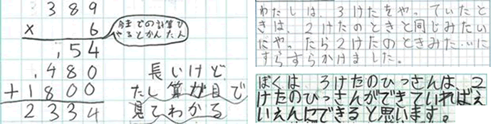 (2位数)×(1位数)の計算の中で「部分積」というキーワードを重視して授業を継続した結果,(3位数)×(1位数)においても,児童は部分積の考えを用いることで解決していく姿が見られた。