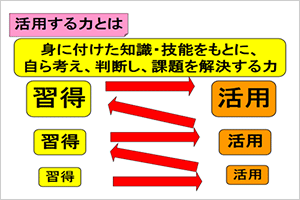ここでは,活用する力とは,身に付けた知識・技能をもとに,自ら考え,判断し,課題を解決する力と定義する。習得との関係は,習得できたから,活用できるという一方向的なものではなく,互いを行ったり来たりしながら,学びを深め,高めるものと捉える。この関係を螺旋的・反復的に繰り返し行うことで,効果が高まり,進んで生活や学習に活用しようとする態度を育てることにも繋がっていくと考える。【図①】
