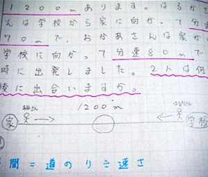 「つかむ・見通す」段階で,既習事項との比較からめあてを立てることできちんと見通しをもたせることが,かく活動への一歩となる。その際,問題を図に表現させることで,問題から図がイメージできないのか,図はイメージできているがそこから立式できないのか課題を明らかにした。式を説明する際には,「どうしてその式になったのか」自問自答させ,それを箇条書きで記述させるようにした。また,モデルとなる児童のノートを積極的に紹介し,ノート記述による表現力を高めるようにした。【写真①】
