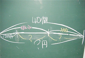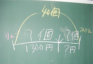 2つの板書を取り上げることで,比較によりどこに間違いがあるのか児童に気付かせる材料とした。この図を示す事で,学び合いの中で,「りんごの値段は1300円ではなく,みかんより1300円多い」のだから【写真④】のような図になることに気付かせることができた。もし,児童から間違った解答が出てこない場合には,教師が間違った解答を示し,児童の考えをゆさぶり理解を深める方法をとった。