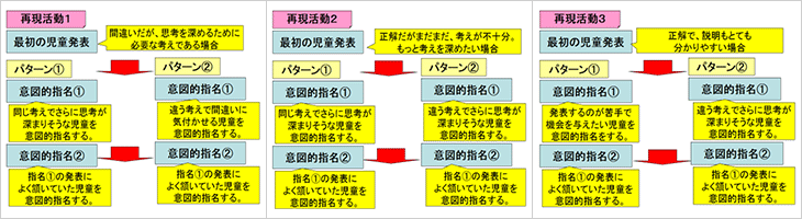 ここで述べる再現活動とは,ある児童の意見を参考に他の児童が自分の言葉で再度説明する活動のことである。まず,再現活動においては以下のような基準に基づいて意図的指名を行った。【資料②】